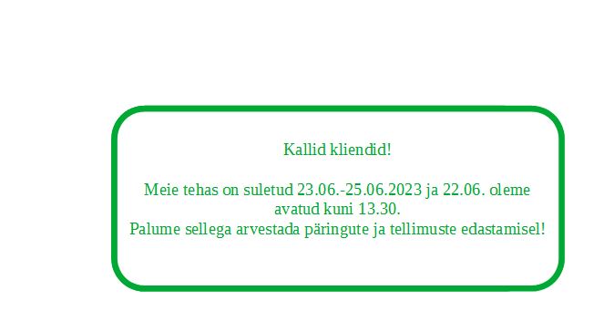 Aastapäevale eelneval tööpäeval (23.02.2023) sulgeme tehase kell 13.00.