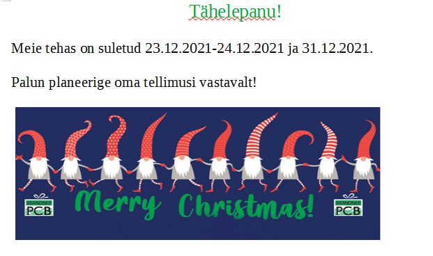 Seoses Eesti vabariigi aastapäevaga 24.02.2021 on Brandner PCB tehas suletud.