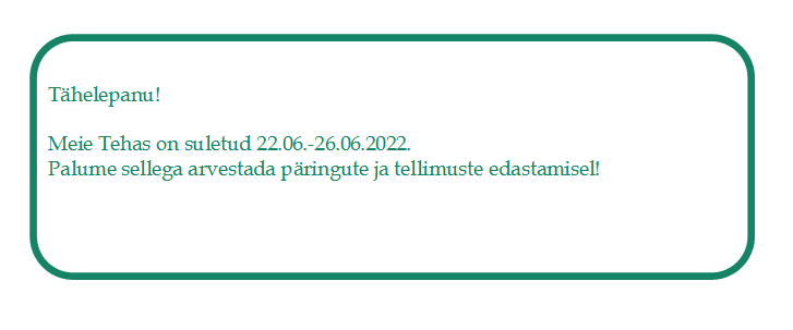 Aastapäevale eelneval tööpäeval (23.02.2021) sulgeme tehase kell 13.00.